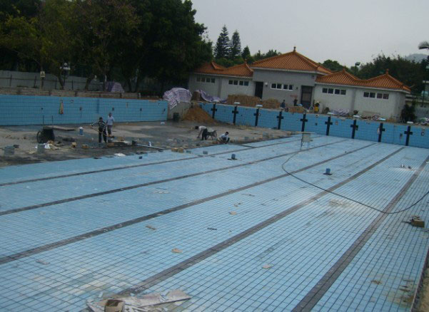 裝修施工前須對泳池蓄水48小時試驗(yàn),灌水后池壁外表面不得出現(xiàn)陰濕,每晝夜水量損耗小于每方2升,以檢驗(yàn)砼的抗?jié)B效果,確不滲漏,才進(jìn)行裝修施工,否則需采取措施,直至不滲水為止,再進(jìn)入裝修。